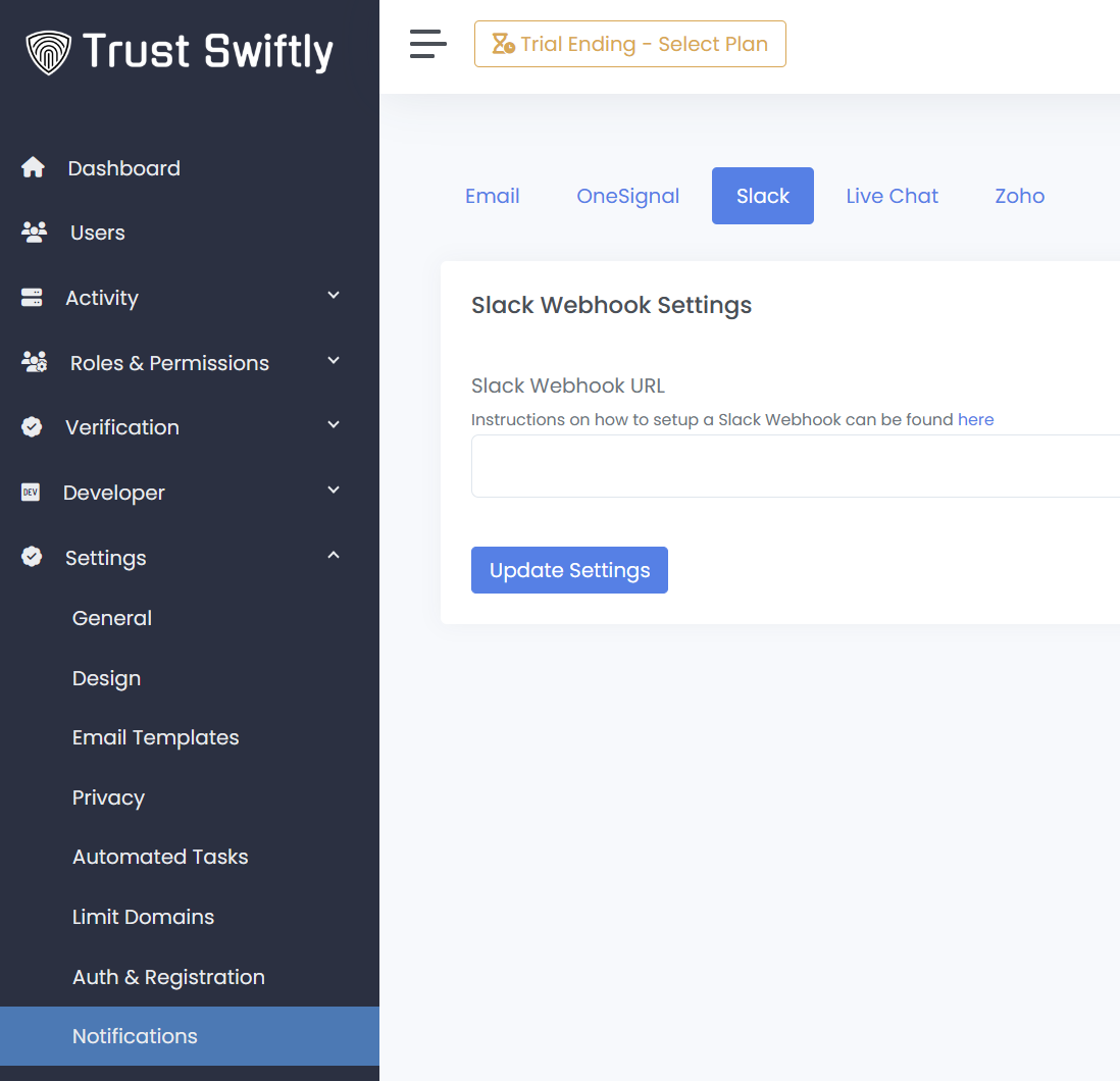 1. **Navigate to Notification Settings:** In your Trust Swiftly dashboard, go to **Settings** -> **Notifications** and select the **Slack** tab.